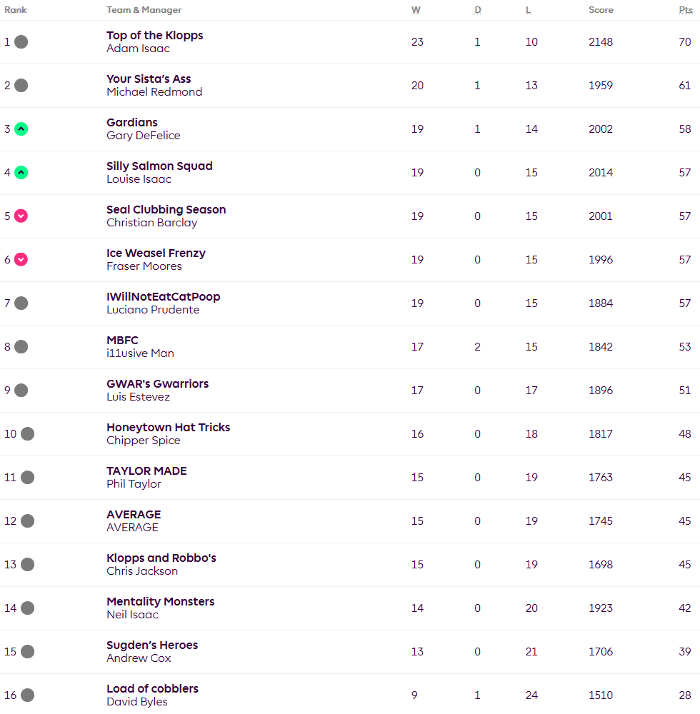 A defeat for Adam means the gap has closed to nine points to Mike and takes us into another week without the title decided. The wooden spoon can be very much awarded to Dave, 11 points behind Andy with 12 points to play for, technically not over but, well, it is, isn’t it.