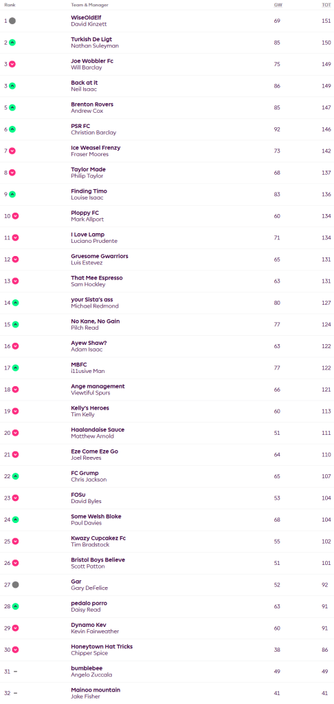 Wise Old David manages to cling on to top spot after week 2 but was some distance off top scorer for the week Christian who triple captained a certain Erling Haaland to make the most of his HatTrick against Ipswich. Neil came in with the second highest score of the week with 86 (captain Haaland) and then Nathan and Andy both got 85 points and third highest score of the week. Andy’s team contains one of the other standout performers of the week in Cole Palmer while Nathan has gone with long term FPL banker Mo Salah alongside Haaland.