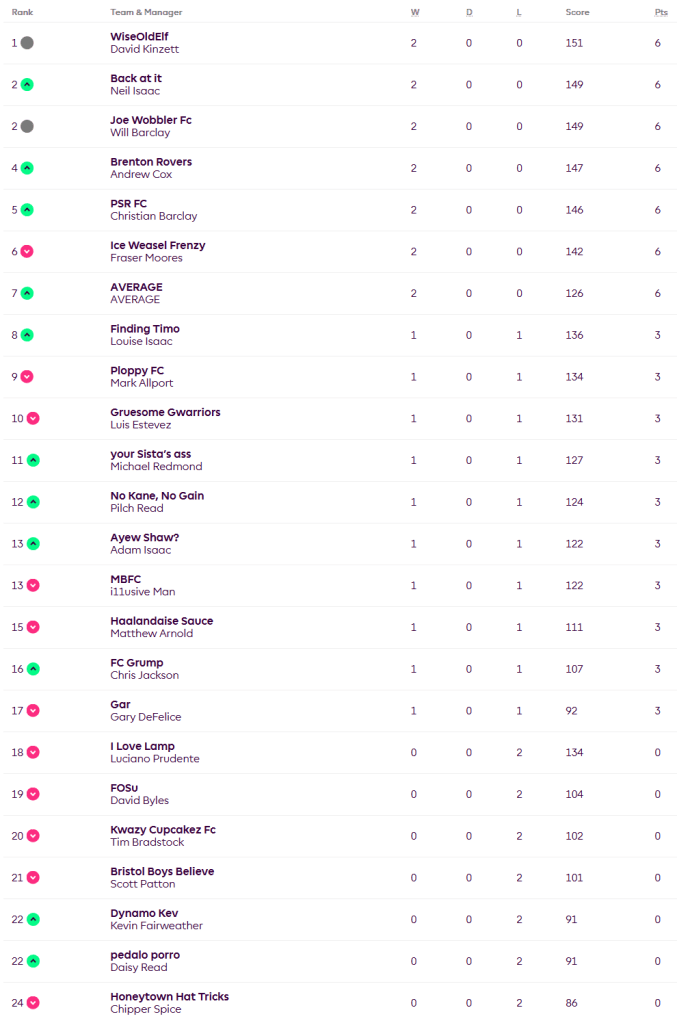 Our main league leader David stays top after week 2 in the Head to Head league too. 6 real people have won both games and the mysterious amorphous entity that is AVERAGE joins them on 6 points. A narrow victory for Michael against i11usive Man came thanks to the heroics of his captain Cole Palmer. Poor Kev had the bad luck of being drawn against top scorer Christian and was duly thumped.