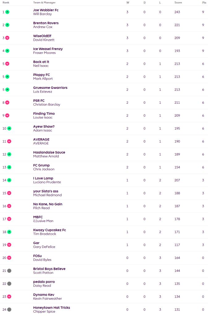 The AVERAGE has finally been defeated by a whole living human leaving us with 4 actual people on 9 points and 100% wins in the Head to Head league. 5 people remain pointless at the bottom and have a bit of work to do to stay in touch.
