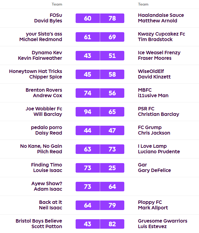 Lou smashed Gary in the biggest drubbing of the week by 49 points, while Daisy was narrowly defeated by Chris in the closest match of the week. Have to mention the big win for Will over his dad, which I’m sure won’t be mentioned much.