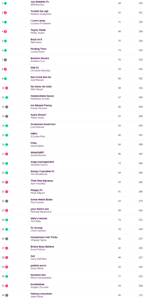 Will’s Joe Wobbler FC has returned to the summit after a week away but there’s just a single point between him and Nathan’s Turkish De Ligt. There’s an 18 point gap to third but 7 points cover the next seven places as it gets close at the top end of the table. Top score of the week went to Joel with 84 points, he had joint top player of the week Luis Diaz who continues to deliver for Liverpool at this early stage of the season. A goal for Ezri Konsa in defence and points for midfield bargains Emile Smith-Rowe and Morgan Rogers helped, along with a goal and bonus points for Erling Haaland and an assist for his captain Mo Salah. Eight teams scored in the 70s but Chris’s FC Grump came in second on the week with 78. He captained Haaland and had the other joint top scoring player Nicolas Jackson and good points from Trent Alexander-Arnold, Smith-Rowe and Bryan Mbuemo. Our third highest scorer was Kev, he also captained Haaland, had Mbuemo, Luis Diaz, Konsa, Watkins and Smith-Rowe.