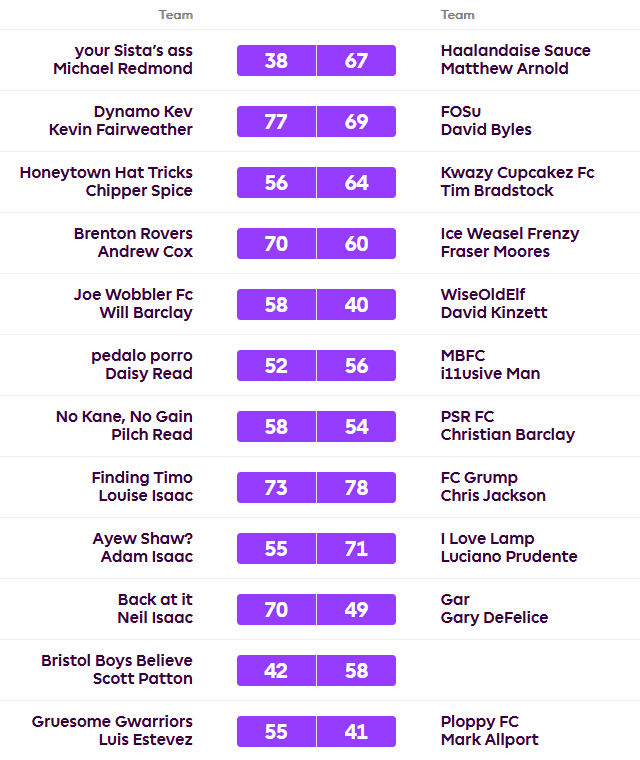 Just one team left with a 100% win record, Will’s Joe Wobbler FC seeing off David’s WiseOldElf 58-40. Three teams at the bottom are now yet to win as Kev got off the mark in a 77-69 victory over Dave’s FOSu. Two games only had four points in it with i11usive Man taking out Daisy 56-52 and Pilch won 58-54 against Christian. The biggest thumping of the week occurred between Matt and Michael as Matt’s Haalandaise Sauce emerged victorious in a 67-38 encounter. Lou’s Finding Timo can be justified feeling a little hard done by losing out 73-78 to Chris’ FC Grump.