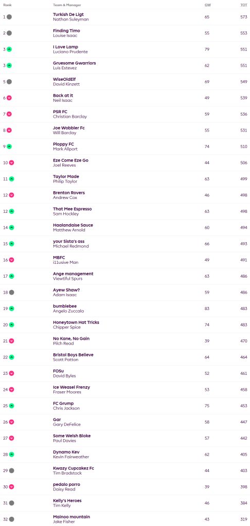 Nathan holds on to first place with returns from Mo Salah, Nicolas Jackson, Josko Gvardiol and top scorer of the week, Bryan Mbeumo. He also had Haaland as captain with a slightly underwhelming return of 12 points against the previously leaky Southampton defence. Lou maintained second place with a decent haul from Cole Palmer and Danny Wellbeck alongside Mbeumo and captain Haaland. Luciano made a big jump up to third from eighth thanks to a clean sheet from Dean Henderson in goal, Gvardiol, while all his front seven returned with points from Luis Diaz, Emile Smith-Rowe, Bukayo Saka, Cole Palmer, Liam Delap, Erling Haaland and Chris Wood, and yet he was not the top scorer in our league last week. That honour went to Angelo who captained Mo Salah and also had Mbeumo, Saka, Palmer, Gvardiol and Wood. Luciano did have the second highest score and in third was Chris’ FC Grump, he had Wood, Jackson, Palmer, Mbeumo, captain Haaland and also Lucas Digne and Rico Lewis at the back.