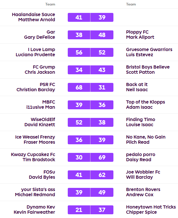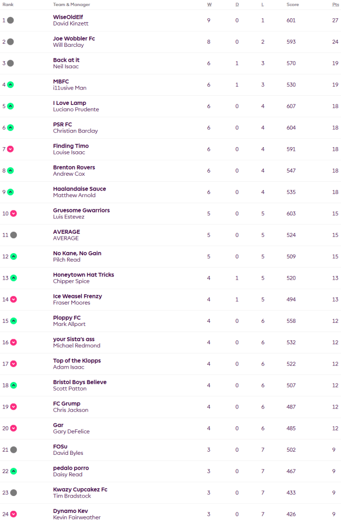 David wins 52-38 over Lou to maintain a three point gap at the top. Will also won, 62-41 over Dave to hold on to second place comfortably. Neil is joined on 19 points in third by i11usive Man, as Neil lost out 68-31 in almost the biggest thumping of the week to Christian and i11usive Man beat Adam 39-36. Luciano, Christian, Andy and Matthew joined Lou on 18 points as she lost while they all won. Daisy beat Tim 69-30 in the biggest win of the week while Matthew snuck the win by the tightest of margins in a 41-39 victory over the AVERAGE.