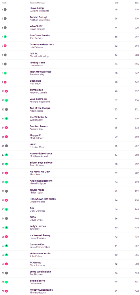 As Everton v Liverpool got postponed due to Storm Darragh, several managers suffered to varying degrees. Some made transfers they hadn’t been planning to make, while others were forced to ride it out and hope for the best. Our leader Luciano was one of those to suffer, his quartet of Everton and Liverpool players certainly did not help him on his way to 38 points, luckily for him Cole Palmer stepped up to deliver 18 points and Chris Wood netted for 8, unfortunately he had the armband on Mo Salah and his vice captain Bukayo Saka had a goal ruled out for offside in the build up. Second placed Nathan also scored 38 but it was Bruno Fernandes and Bryan Mbeumo that gave him his points, his vice captain Joao Pedro also failing to to step up in Salah’s absence. Third placed David had it slightly better with 44 points, the combo of Palmer and Wood added to with points from Marc Cucurella and Kai Havertz. Daisy Read managed to outdo everybody else with a score of 69 thanks to returns from Palmer, Jadon Sancho, Ezri Konsa, Erling Haaland (yes, really), Alexander Isak, Callum Hudson-Odoi and captain Dominic Solanke.