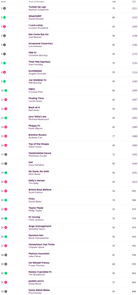 Nathan begins 2025 in top spot gaining 70 points in the week with captain Mo Salah bringing home 32 points alone, his total added to by Josko Gvardiol, Tyler Dibling, Morgan Rogers and Alexander Isak. Up to second goes David with 86 points on the week and just a single point behind first place. His captain Salah’s points came alongside returns from Virgil Van Dijk, Lewis Hall, Pedro Porro, Antonee Robinson, Luis Diaz and Chris Wood. Luciano has slipped to third overall after scoring 69 this week, his points coming from captain Salah, Wood, Isak and Van Dijk. Joel took a four point hit to get joint top score of 96 for the week with Pilch using his Bench Boost to gain 9 points extra for the same total. His points came from Ola Aina, Gvardiol, Rogers, Dejan Kulusevski, captain Salah, Ollie Watkins, Erling Haaland (remember him?) and Martin Dubravka.