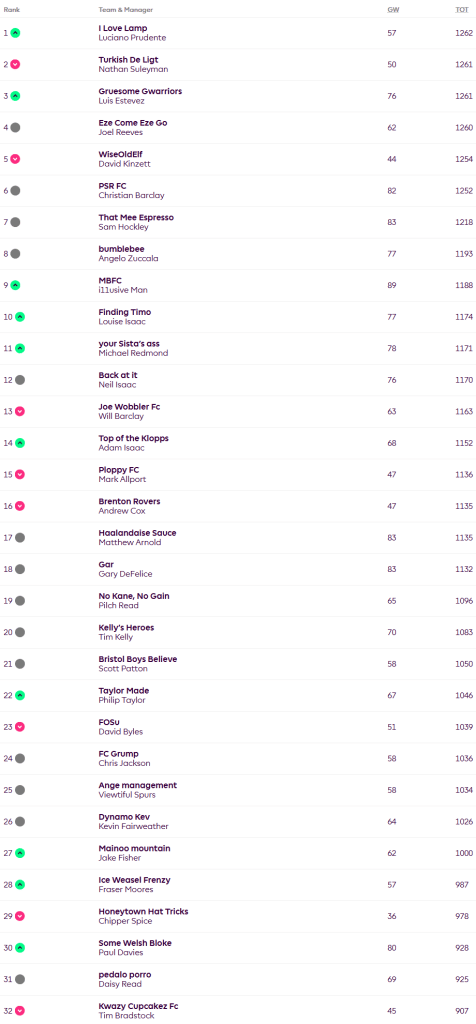 The only chip played was Neil’s second and final Wildcard, first week delivered 76 points which is definitely an improvement on recent scores. Could it be a master stroke or a disaster class, only time will tell. One team took a four point hit to make changes and it was our new leader Luciano.