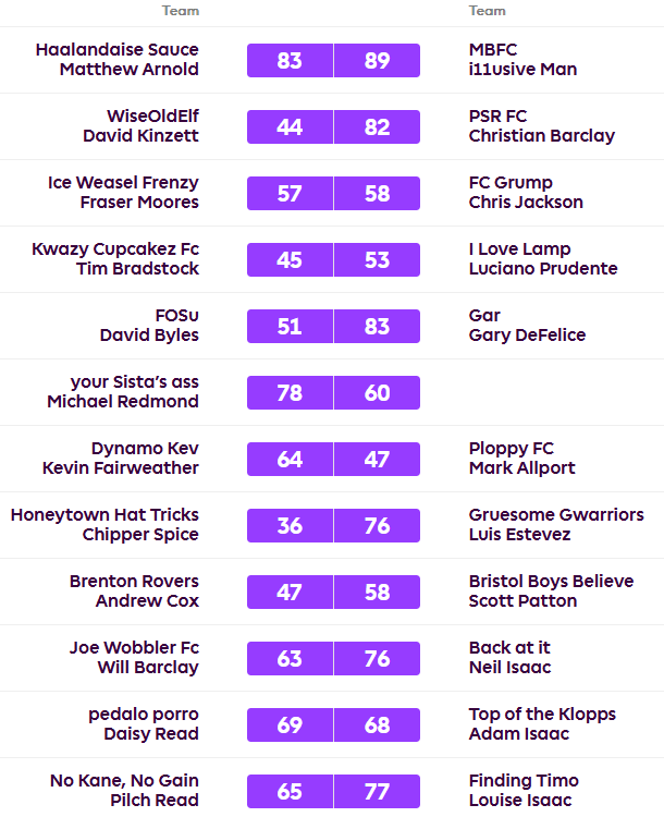 David remains top on 45 points but the lead is down to six points after he lost 44-82 to Christian who moved up to fifth on 36. Luciano beat Tim 53-45 to hit 39 points and was joined there by Lou who won her game against Pilch 77-65. Luis trounced Chipper Spice 76-36 to move up to fourth on 37. Fraser lost again, this time by just a single point 57-58 to Chris, Daisy also beat Adam by a single point 69-68.