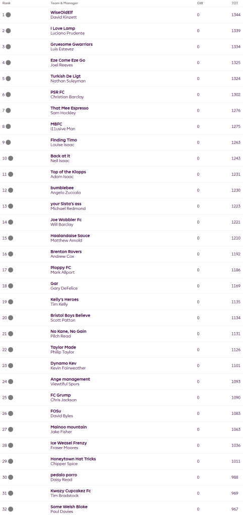 I was late grabbing the league table so I’m a bit light on details this week but here is this week’s write-up. David has hit the top going 5 points clear with the high score of the week of 90 having played his Wildcard. Dean Henderson, Daniel Munoz and Lewis Hall all delivered clean sheets while his captain Cole Palmer netted along with Alexander Isak and Jean Phillipe Mateta with the astonishing Hat-Trick of Amad Diallo being the icing on the cake. Luciano now sits second after scoring 81 thanks to his captain Palmer and the defensive trio of Henderson, Munoz and Hall, other points came from Anthony Gordon and Chris Wood along with Isak and Bruno Fernandes. Luis scored 73 points on the week and holds third spot, his points came from captain Palmer, Wood, Isak, Gordon and Antonee Robinson.