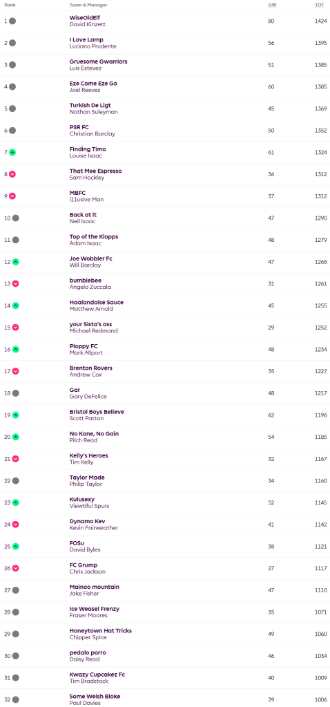 With many of the traditional big hitters failing to return, the average score was only 46 points which makes David’s 80 point haul to extend his lead at the top look even more impressive. David played his Bench Boost and made a great move by playing Chris Wood as captain as he scored and assisted, the triple up on Crystal Palace paid dividends as Dean Henderson and Daniel Munoz both kept clean sheets and Jean-Phillipe Mateta scored twice, Lewis Hall grabbed an assist and Virgil Van Dijk also kept a clean sheet to round off the scoring. Second placed Luciano could only manage 56 points, he also had Henderson, Hall, Munoz and Wood but chose to captain Alexander Isak who failed to deliver for the first time in nine games, fortunately for Luciano he also had Antonee Robinson and Bruno Fernandes that chipped in with some decent points. Luis sits third still also having Wood and Robinson, he captained Cole Palmer as he blanked but got nice hauls from Trent Alexander-Arnold and Ola Aina.