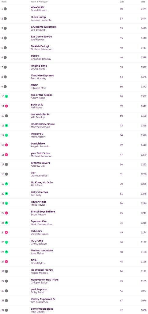 No change in places for the top nine teams as the top seven all scored under the average for the week thanks in large to under performance of some of the highly owned assets with only Mo Salah, Alexander Isak and Bryan Mbeumo returning for them. The big scores this week came from outside the top ten of last week, Adam moved into the top ten with a score of 78, the likes of David Raya, Milos Kerkez and Cody Gakpo moving him up the table. Mark’s Ploppy FC also moved up after scoring 84, Gabriel and Gvardiol at the back in addition to in form Bournemouth assets, Antoine Semenyo and Justin Kluivert delivering nicely. Tim’s Kelly’s Heroes scored 81 with a very similar set up to Mark, but the biggest score of the week came from Phil’s Taylor Made with 86 points, coming from Raya, Gvardiol, Pedro Porro, Semenyo, captain Salah, Isak and Gakpo.