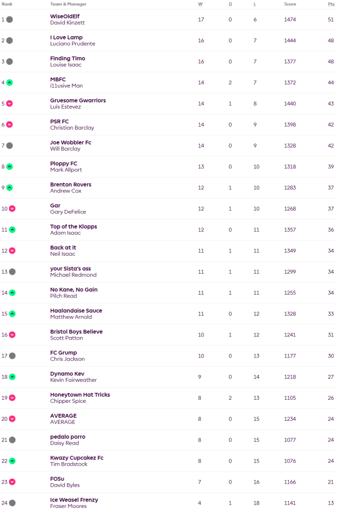 Leader David finally lost a game, 50-67 to Tim’s Kwazy Cupcakes, and both Luciano and Lou took advantage to close the gap to three points. Luciano narrowly beat ChipperSpice 49-45, while Lou beat Scott 53-45. Luis lost out 55-70 to Pilch which left the door open for i11usiveMan to jump into fourth having beaten Dave 60-45. Fraser scored well but still managed to lose 70-73 against Matt so is still eight points adrift at the bottom.