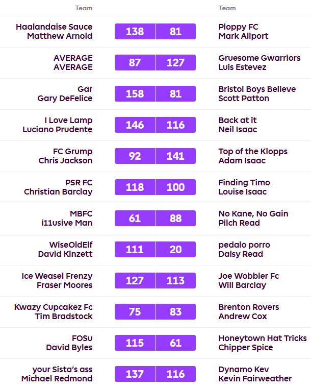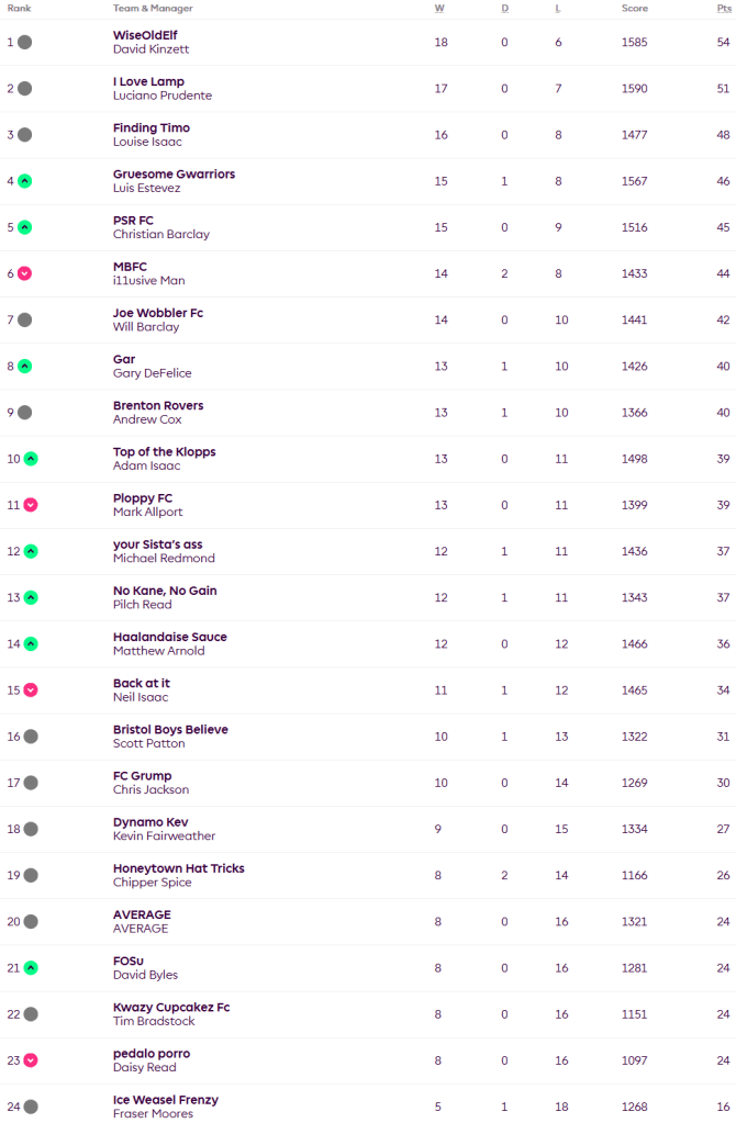David’s lead remains three points as he won 111-20 over Daisy in one of the most one-sided fixtures we’ve ever had, Luciano is keeping up the pressure with a victory over Neil 146-116 but Lou has slipped up after losing 100-118 to Christian who promptly moved up to fifth. Luis moved up to fourth with a 127-87 win over the Average. Fraser beat Will 127-113 but remains eight points adrift as Dave won his game against Chipper Spice 115-61 to join three other teams on 24 points.