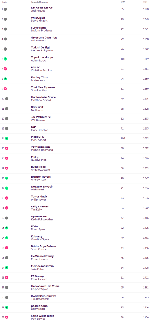 Two Wildcards were played in this week, i11usiveMan and Daisy both fancied a change and scored 74 and 83 respectively. Viewtiful Spurs went with the Bench Boost chip to score 79. We now have fifteen managers on the Assistant Manager chip as Pilch activated the chip this week and opted for Ange Postecoglou and duly got ten points from him. Most of the other fourteen assistants were on their last week, Lou and Tim kept faith with Arne Slot and received ten points. Chris, Mike, Gary and Matt stuck with David Moyes for five points. Luis and Adam chased the table points bonus and switched to Oliver Glasner and were rewarded with twenty points. Neil switched to Thomas Frank and got 12 points while, Dave, Joel, Christian, Sam and Mark all kept Unai Emery for his eight points. It’s been controversial to say the least but the Assistant Manager chip has proven to be very powerful if played aggressively and things go your way and even if played safe at the right time it can still be very rewarding going for a safe option like Arne Slot, baring in mind he had five games over the three gameweeks since the chip became available he returned 38 points during that time.