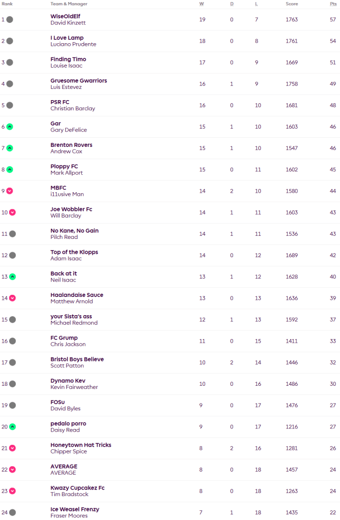 David slipped up 93-99 to Luis, while Luciano beat Matt 95-70 to cut the gap to just three points. Lou is six points from top and remains third after winning 94-80 over Mike, with Luis two points further back in fourth. Christian beat the average 81-62 to stay fifth a single point behind Luis. Fraser bagged another win 76-44 over Scott to move just two points from Tim and average at the bottom.
