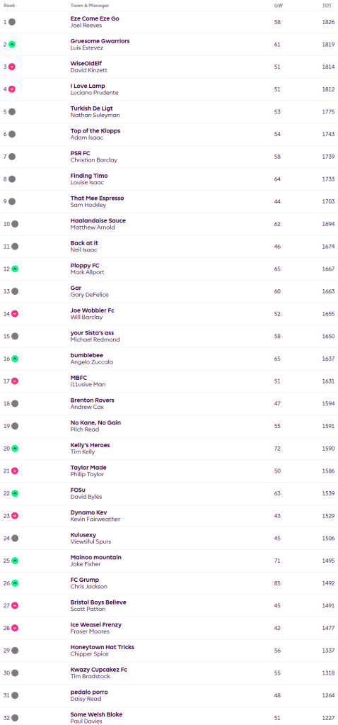 Once again the big scores on the week come from the, less, top, part of the league. At the top Joel is holding on to first place on 1826 points and scoring 58 for the week, his score coming from Daniel Munoz, Trent Alexander-Arnold, Jurien Timber, Justin Kluivert, Bruno Fernandes, and captain Mo Salah. Luis is up to second and closed by three points leaving him on 1819 for the season, his 61 points came from Matz Sels, Alexander-Arnold and Ola Aina, Kluivert, Bryan Mbeumo, Yoanne Wissa and captain Salah. Long time leader David is back in third now on 1814 for the season, his 51 for the week came from Virgil Van Dijk, Aina, Morgan Rogers, Mbeumo, Salah, captain Cole Palmer and Jean Phillipe Mateta. Top score for the week came from Chris who rose to 26th in the league as a result of his 85 points which came from Sels, Van Dijk, Gabriel, Marc Cucurella, Kluivert, Christopher Nkunku, captain Salah, Mateta and his Assistant Manager David Moyes.