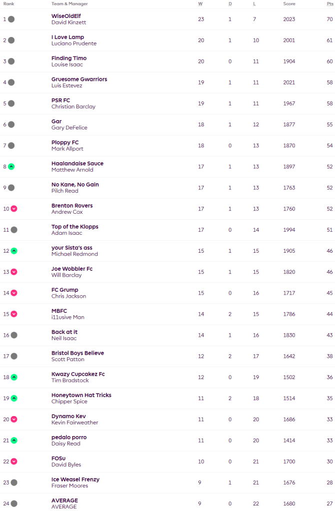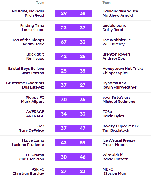 David has stretched the lead out to nine points once again as he defeated Chris 46-30 while Luciano lost out to Fraser (yes, really) 43-59. Lou also lost out in third place 23-37 to Daisy (yes, really). Luis and Christian round out the top 5 level on points with wins over Kev 37-27 and i11usiveMan 27-23 respectively. Fraser’s win over Luciano was much needed to keep him off the bottom as the Average got back to winning ways beating Dave 34-33.