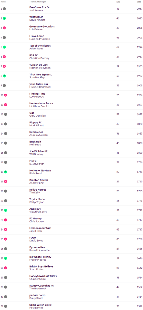 Joel sits top on 2037 points for the season having played his Wildcard and scoring 41 points in a week where the average was just 34 with many highly owned players underwhelming, Joel had points returns from Daniel Munoz, Josko Gvardiol and Jean Phillipe Mateta, leaving Morgan Rogers and Dan burn on the bench with decent hauls will sting a bit, but the squad looks set nicely for the coming weeks. David moves up into second place on 2023 after scoring 46 for the week, he got returns from Noussair Mazraoui, Rogers, Jorgen Strand-Larsen and his Assistant Manger Oliver Glasner. Dropping in to third place is Luis, his 37 points for the week leaves him two points behind David and his points came from Dan Burn, Jarrod Bowen, and Mateta. Top score of the week came from Adam with 67, he had Munoz, Burn, Gvardiol and Mateta and also got returns from Ebereche Eze and Jacob Murphy.