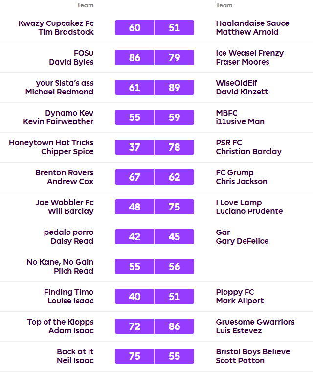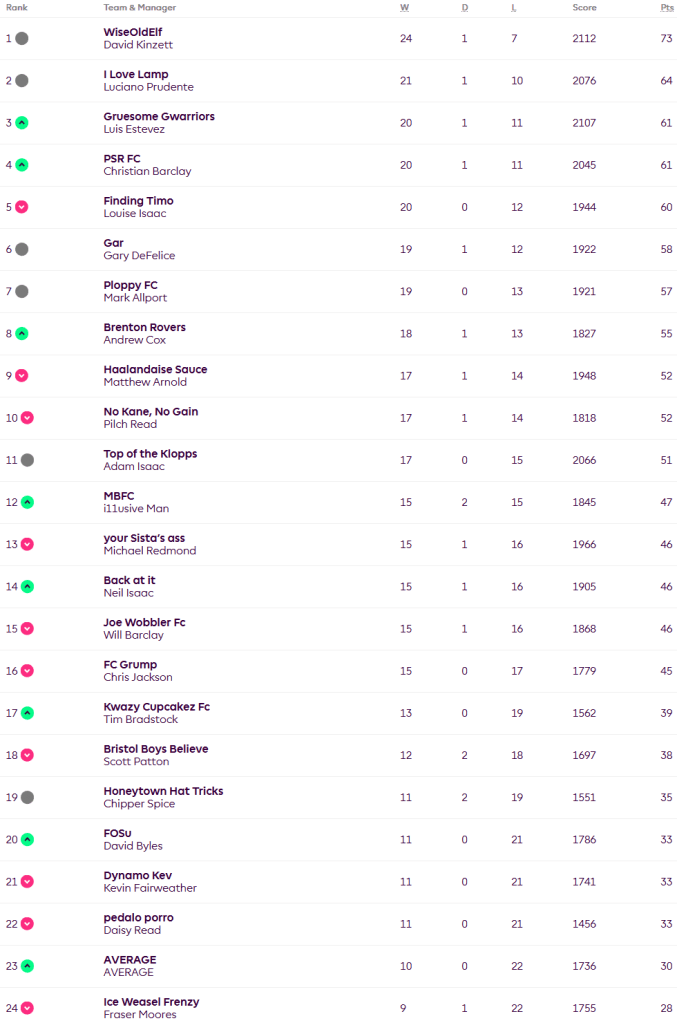 David is on for the double as he won again, 89-61 over Mike staying nine points clear of Luciano whoe beat Will 75-48. It’s all change for the next three places as Lou lost out 40-51 to Mark and Luis beat Adam 86-72 and Christian won 78-37 over ChipperSpice. Fraser has returned to his rightful place at the bottom of the league having lost 79-86 to Dave and the Average pipped Pilch 56-55.