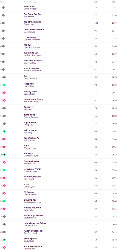 David remains top but his lead has been cut down to seven points and the top four are covered by just fourteen points going into the last four weeks of the season, he scored 75 for the week on his Free Hit and was rewarded by Rayan Ait-Nouri, Kieran Trippier, Luis Diaz, Mo Salah, Jacob Murphy, Alex Iwobi, Jorgen Strand-Larsen and captain Alexander Isak. Joel sits second and scored 77 points also playing his Free Hit, his points came from Ryan Sessegnon, Ait-Nouri, Trent Alexander Arnold, Antoine Semenyo, captain Salah, Isak, and Strand-Larsen. Another Free Hit and top score for third placed Adam with 100 points coming from Sessegnon, Ait-Nouri, Trippier, Murphy, Iwobi, captain Salah, Diaz, Strand-Larsen, Isak and Matheus Cunha.
