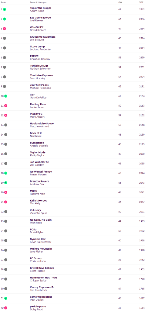 With just two weeks of the season remaining we have a new leader, and second place, as David has finally been toppled by both Adam and Joel. Adam’s net gain of 58 points was enough to put him top on 2362, he took a four point hit but had good returns from Alphonse Areola, Daniel Munoz, Josko Gvardiol, Ebereche Eze and captain Bryan Mbeumo. Joel also opted for the four point hit and also had Areola, Munoz, Gvardiol and Mbeumo along with Jarrod Bowen, Morgan Rogers and Chris Wood. Tim’s Kwazy Kupcakes FC was top scorer of the week with a very nice 69, Tim played the Bench Boost chip but only scored an extra seven from there, thankfully his starting XI contained Munoz, Morgan Gibbs-White, Jacob Murphy, Mbeumo and captain Wood (of course).