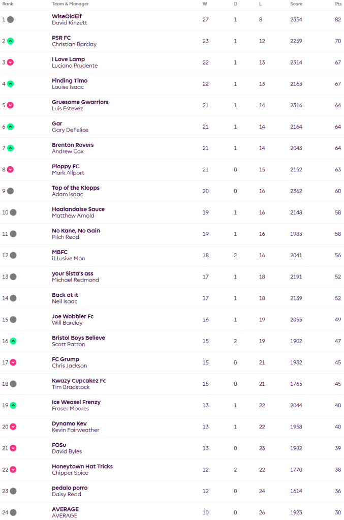 With two weeks left Christian moves up to second on 70 after beating Daisy 54-31, Lou joins Luciano on 67 having beaten him 50-46 and Gary and Andy join Luis on 64 means there is still potential for positions to change below our winner David.