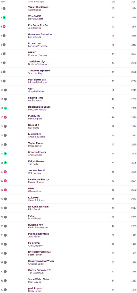 There were only four chips in play last week with Neil playing Triple Captain on Ollie Watkins for 15 points, Matt played Bench Boost for 52 points total, Angelo played Nuno as his Assistant manager for 8 points and Andy played Thomas Frank as his Assistant Manager for two points. A few hits were taken last week with Tim taking a huge 16 point hit for a net gain of 58, Neil, Luis and Luciano all opted for a more reasonable four pointy hit to net 45, 39 and 39 points respectively.