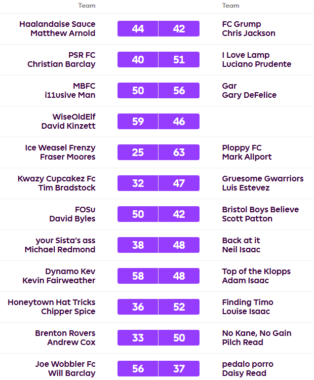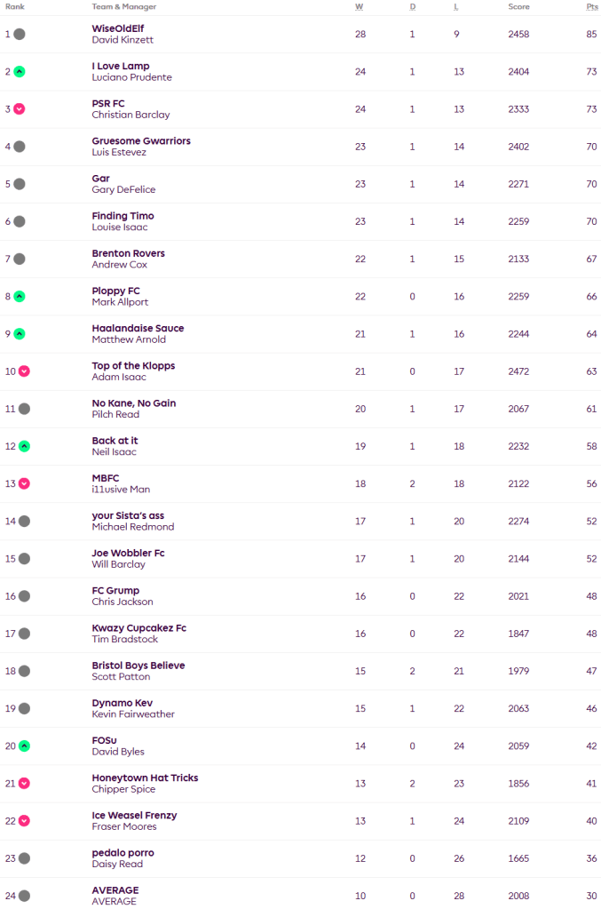 David ends the season with a twelve point lead after winning his final game 59-46 against the Average. Luciano beat Christian 51-40 to go second on total points scored, the two of them finishing on 73 points. Three teams follow on 70 points, Luis, Gary and Lou in that order. A fun twist on the usual FPL game that has thrown up an intriguing order given the final results in the Classic league.