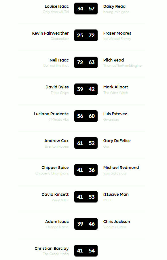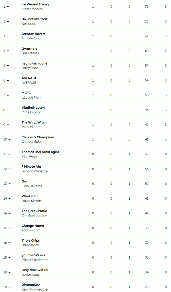 We ended up with 19 humans in our Head to Head league for this season, so the Average is back but at least we get a replication of the Premier League with twenty teams included overall. Speaking of the Average, they got off to winning ways with a 54-41 defeat of Christian, no draws this week so ten teams are on three points and ten are on zero.