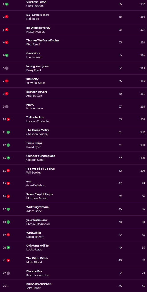 A belter of a week for Chris sends him top of the league, his 86 points was well above the average of 51 and 25 points clear of the next biggest scorers in our league, Christian and Dave. He made the wise decision to captain Joao Pedro who netted him 30 points alone, but the hits kept coming with returns from Viktor Gyokeres, Cody Gakpo, Marc Cucurella, James Tarkowski, Micky Van de Ven and David Raya.