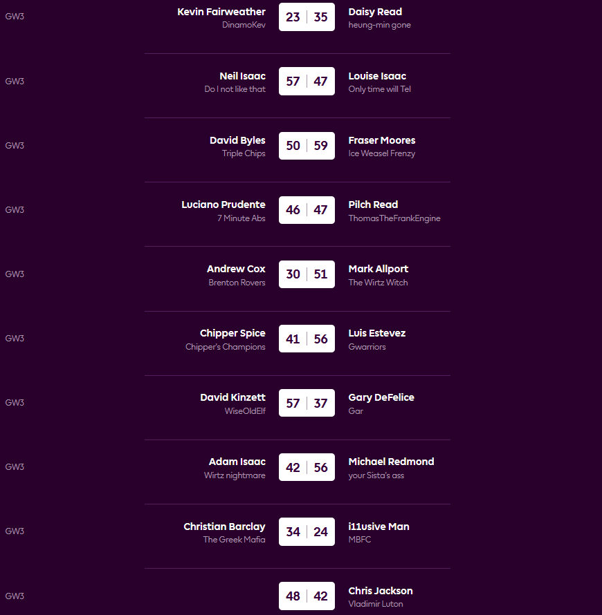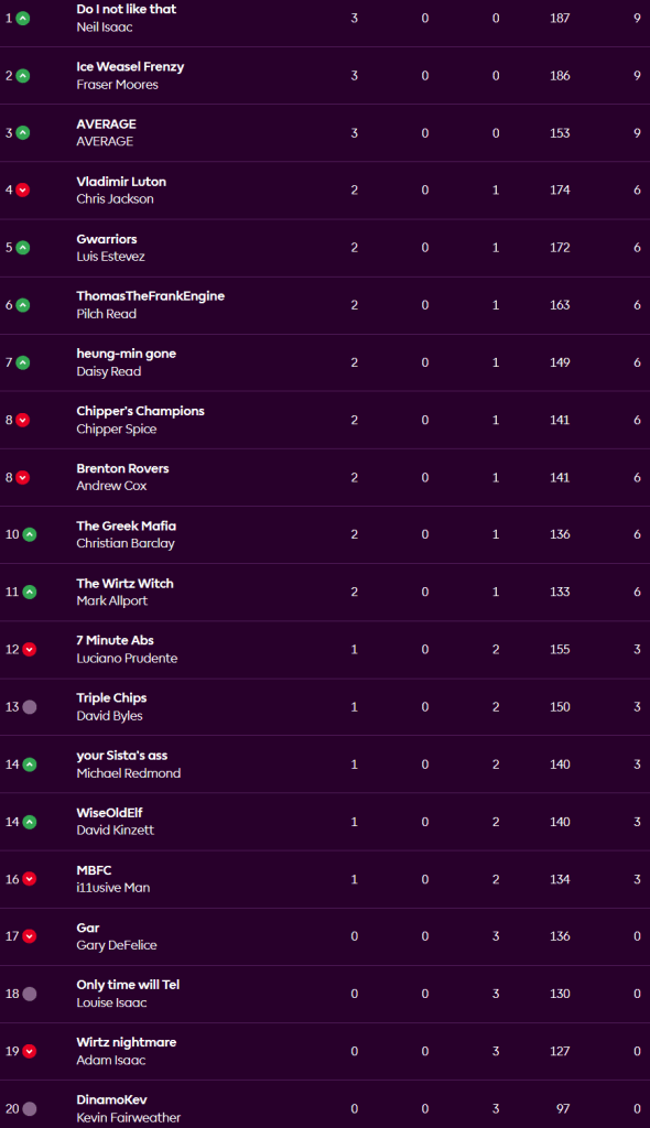 We are down to three teams with 100% win records but one of them isn’t even a real person as the Average joins Fraser and Neil with 3 wins. Still no draws but the closest game was won by Pilch over Luciano 47-46. Four teams remain on zero points at the bottom.