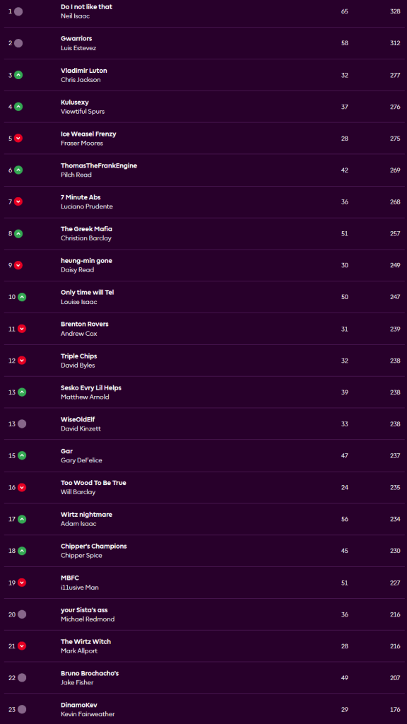 Neil stays top and extends his lead slightly with an underwhelming seven points coming from the Bench Boost chip. His 65 points was top score and was largely down to Dorde Petrovic, Marcos Senesi, Antoine Semenyo, Mohammed Kudus, captain Mo Salah, Jean Phillipe Mateta and Erling Haaland. Luis’ team has a fair amount of crossover with Neil’s and effectively scored the same points but there was no Bench Boost for Luis and his 58 points. It was a relatively low scoring week and ten managers beat or matched the average of 42 points.