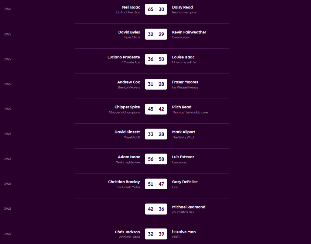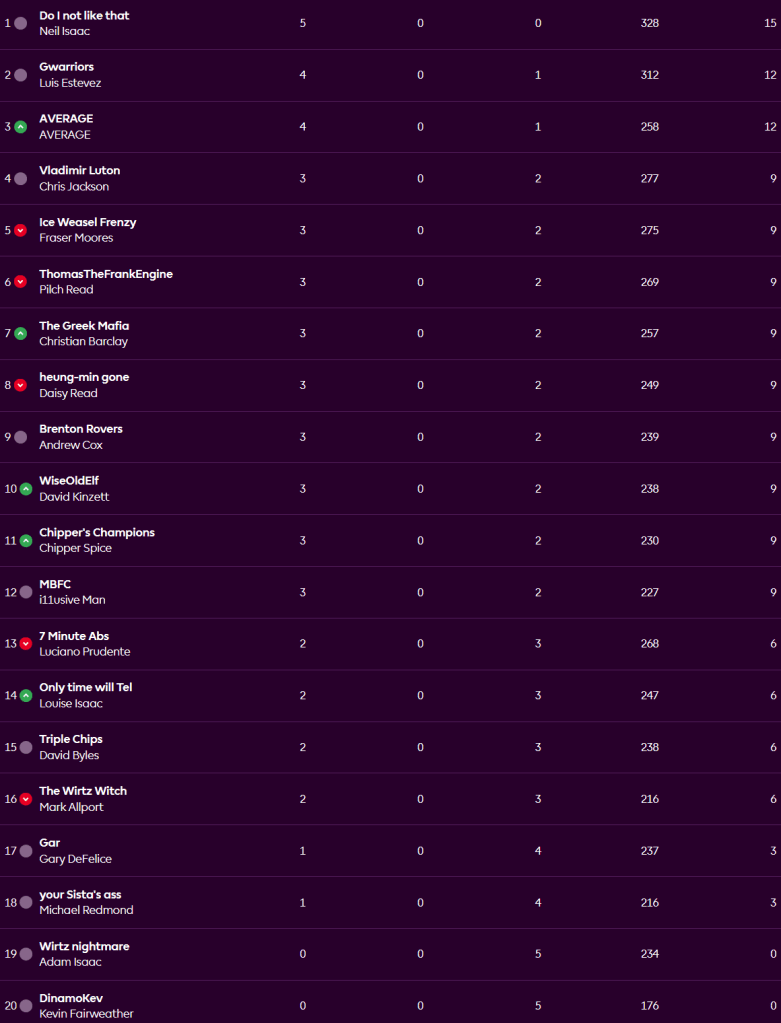 Neil keeps up his 100% win record with a 65-30 defeat of Daisy while Luis is the only real boy in second after his 58-56 win over last year’s champion Adam. The Average is level with Luis after getting back to winning ways as Mike went down 36-42, then nine players are equal on 9 points. Kev and Adam remain pointless, in the league.