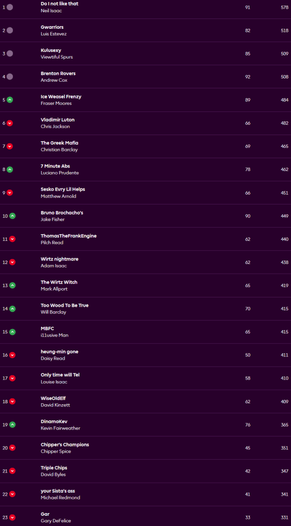 Neil continues his good start to the season with 91 points for the week and remains top on 578, he captained Erling Haaland, brought in Martin Dubravka to the starting XI and had points from Daniel Munoz, Gabriel, Bukayo Saka, Antoine Semenyo and hat-trick man Jean Phillipe Mateta. Luis sits second after scoring 82 for the week and has 518 for the season, Viewtiful Spurs rounds out the top 3 on 509 for the season and scored 85 for the week. Andy netted top score for the week, just, with 92 and is fourth overall on 508, his points coming from David Raya, Marc Cucurella, Gabriel, Nordi Mukiele, Semenyo, Cody Gakpo, Saka and captain Haaland.