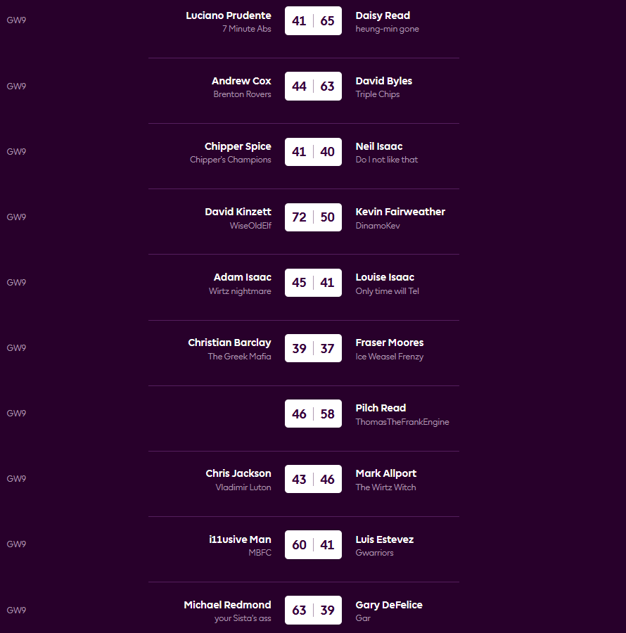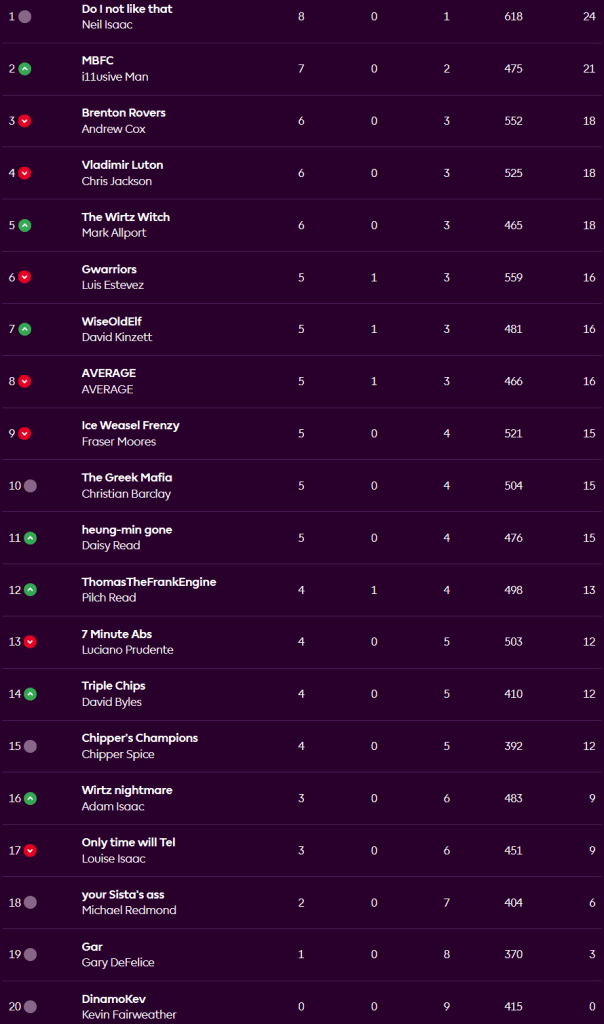 Chipper Spice narrowly took advantage of Neil’s poor week and beat him 41-40 to help i11usiveMan close the gap to just three points as he beat Luis 60-41. Andy lost to Dave 44-63 and Chris lost 43-46 to Mark who joined Andy and Chris on 18 points to complete the top 5, Kev lost out again after a monster twelve point hit left him trailing David 72-50 and still rock bottom with zero poionts.