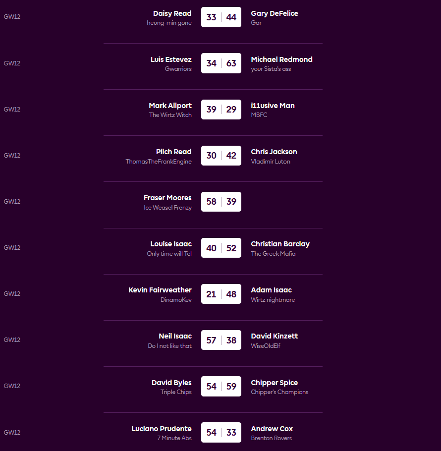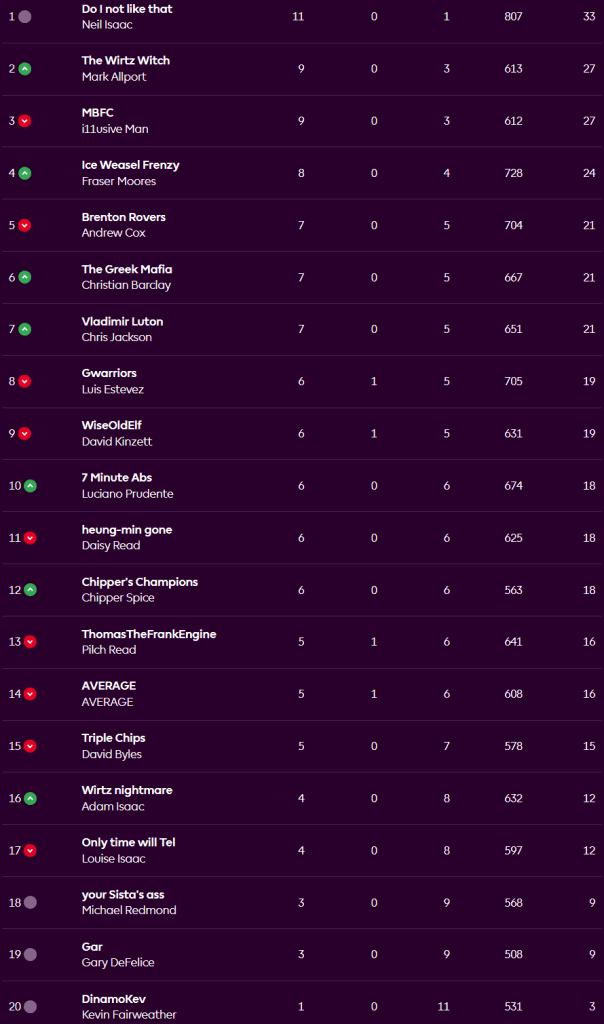 i11usiveMan’s 29-39 defeat to Mark sees them both sitting on 27 points in joint second and allows Neil to extend the lead at the top to six points after he beat David 57-38. Fraser beat the Average 58-39 to move ahead of Andy who lost out 33-54 to Luciano. Kev was back taking hits again and lost 21-48 to Adam and sits bottom of the league on three points, now six points adrift of Gary and Mike who both won.