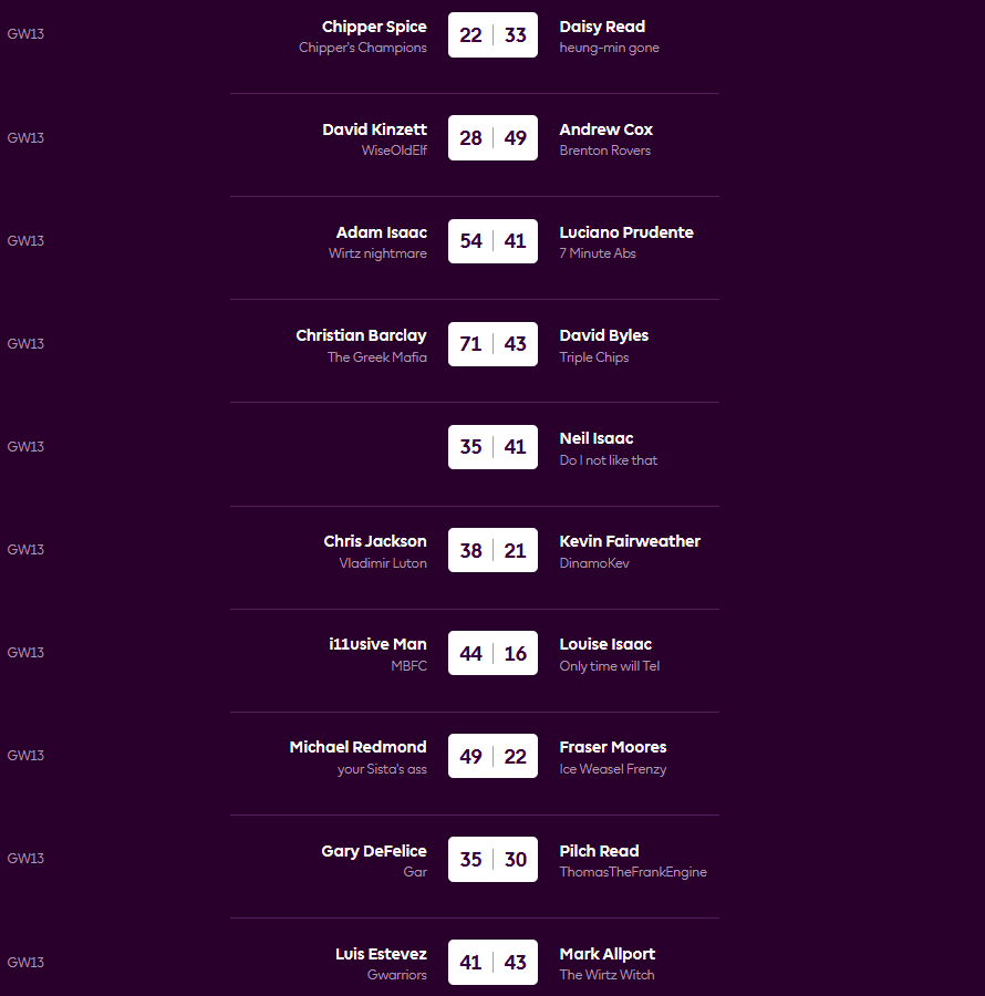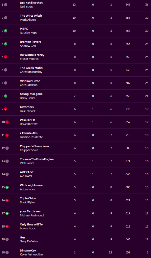Neil beat the Average by six points to remain top, Mark just beat Luis 43-41 and i11usiveMan beat Lou comfortably 44-16 to remain six points behind on 30. A further six points behind are four managers, Andy, Fraser, Christian and Chris. Kev’s love of a points hit means he is well adrift at the bottom now on just three points, who lost to him?