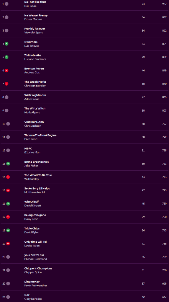 So, there’s a week missing from the updates, so what? Onto Week 15 then, Neil remains top (yawn) on 987 points and is 100 ahead of Fraser in second, behind Fraser is Viewtiful Spurs on 862 in third and then it’s Luis on 854 and Luciano on 852. Luciano had a great week with 79 points but it was our very own Dave that top scored for the week with 84. His first choice captain Mo Salah sat out Liverpool’s game against Leeds and watched on as his team mates threw away leads twice against Leeds before he appeared to lay the foundations of his exit from the club. Stepping in for Dave was Hugo Ekitike with a base of 13 points, fortunately for Dave he’d played his Triple Captain chip so netted 39 as a result, other players to score well were Micky Van de Ven, Jordan Pickford, Aaron Wan-Bissaka, and Kiernan Dewsbury-Hall.