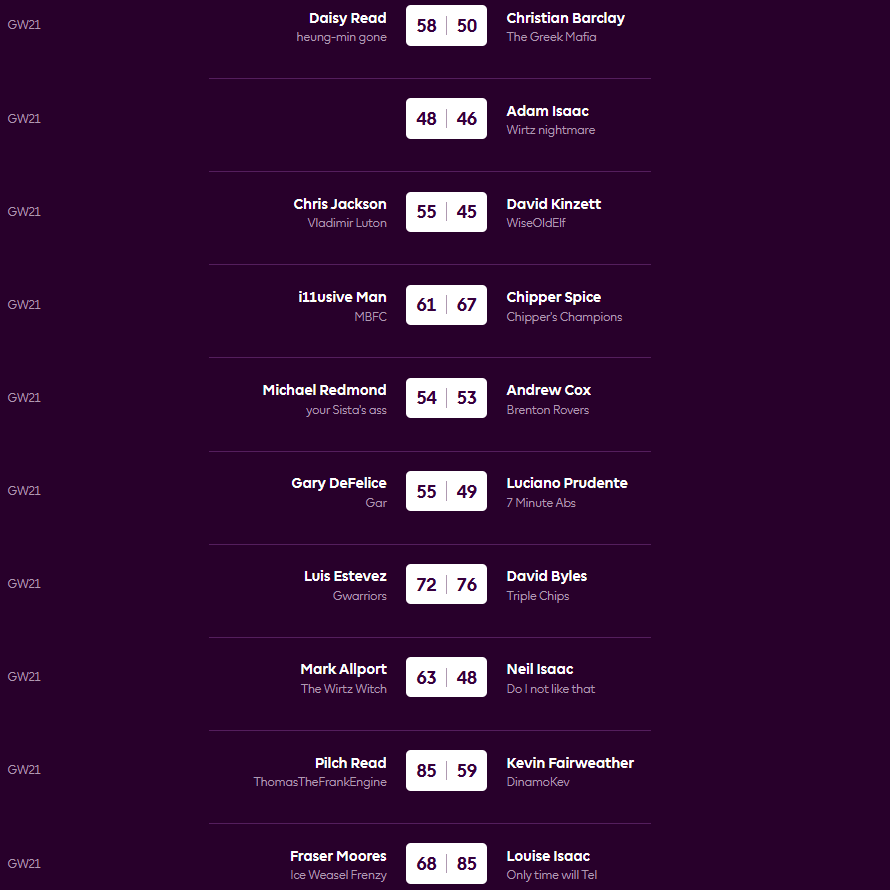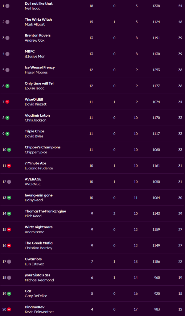 Neil lost once again, this time 63-48 to closest rival Mark, bringing the gap down to 8 points. In third Andy lost by a single point 53-54 to Mike, and in fourth i11usiveMan also lost 61-67 to ChipperSpice. Fraser lost 68-85 to Lou and they are now separated by just points scored overall. Down at the bottom Kev is on his won once again as he went down 59-85 to Pilch and Gary beat Luciano 55-49.