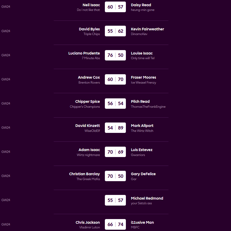 Our top three all won again, Neil beat Daisy 60-57, Mark beat David 89-54 and i11usiveMan beat Chris 74-66. Fraser beat Andy 70-60 to retake fourth place on points scored. Down at the bottom Kev beat Dave 62-55 while Gary lost out to Christian 50-70 and now sits three points adrift.