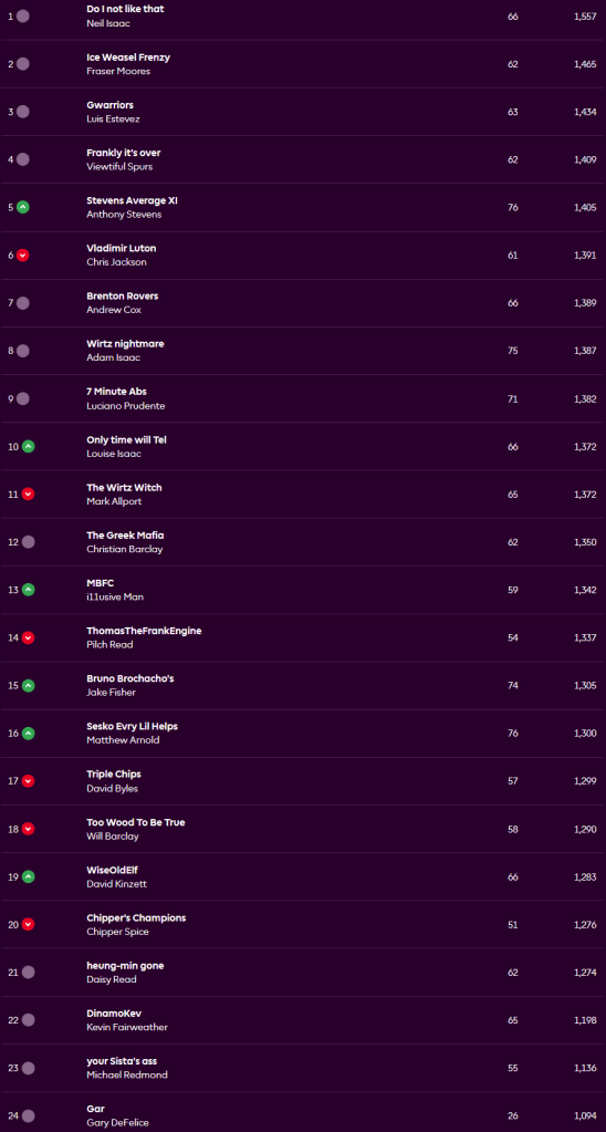 A pretty decent week for most of our league with only five teams scoring below the average of 58, our top four all scored between 62 and 66 so it hasn’t really changed much up there. There was a tie for top score of the week with two teams scoring 76, no surprise that the line-ups are quite similar with both teams containing David Raya’s 7 points, Gabriel’s 6, Marcos Senesi’s 2, Declan Rice’s 5, Bryan Mbeumo’s 8, Erling Haaland’s 11, Igor Thiago’s 5 and Dominic Calvert-Lewin’s 7, both managers captained Bruno Fernandes for 20, so the two differences were Matt having Marc Guehi’s 3 and Antoine Semenyo’s 2 while Anthony had Trevoh Chalobah’s 4 and Joachim Andersen’s 1. Anthony may well be kicking himself a little as sitting on his bench were Kiernan Dewsbury-Hall with 13 points, Morgan Rogers with 10 and Chris Richards with 8, what a week that could have been.