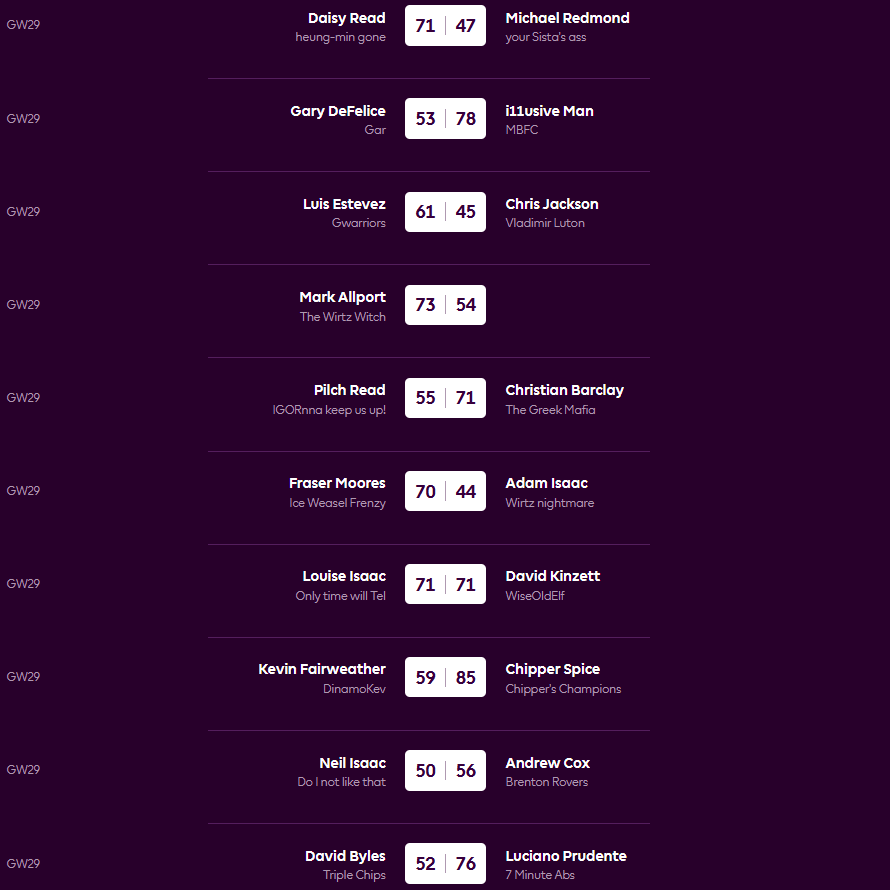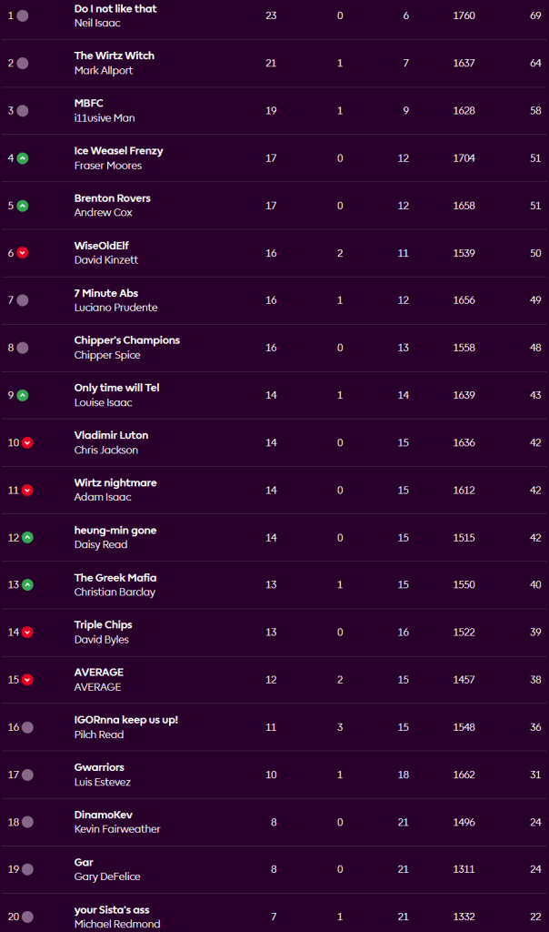 The gap at the top is down to five points as Neil lost 50-56 to Andy and Mark beat the Average 73-54, the gap to third is still six points as i11usive Man beat Gary 78-53, Andy and Fraser are tied in fourth a further seven points back after they both won their games and David could only draw with Lou. Down at the bottom only Luis could muster a win and has opened up a seven point gap to Kev and Gary while at the very foot Mike lost to Daisy 71-47 to remain two points adrift.